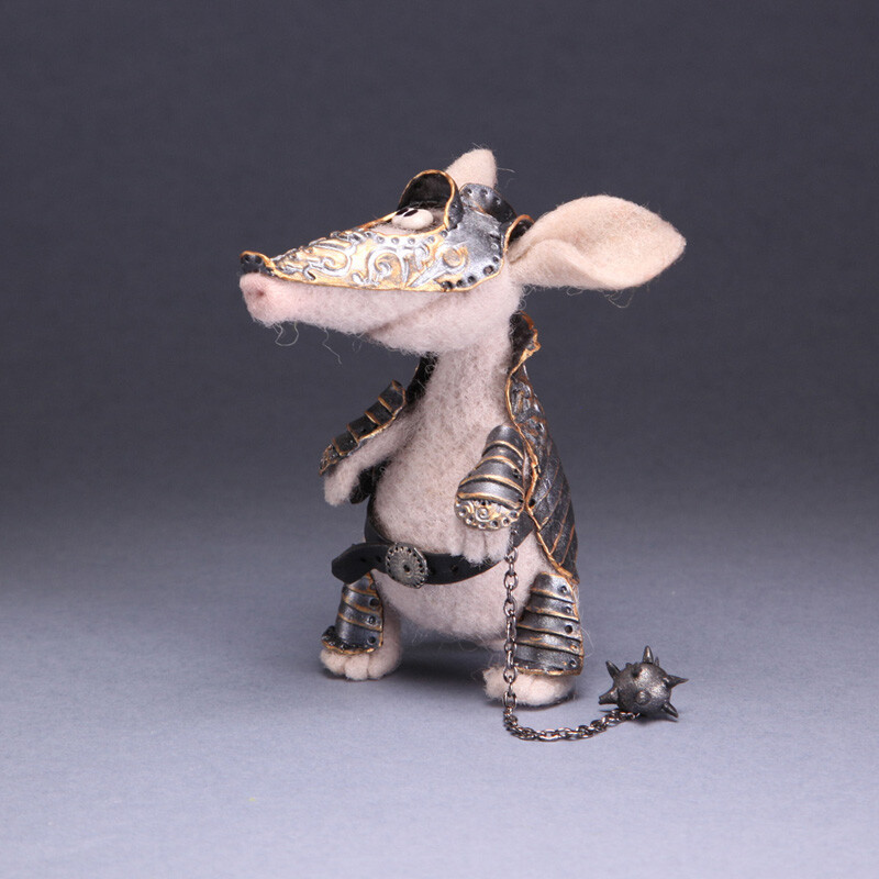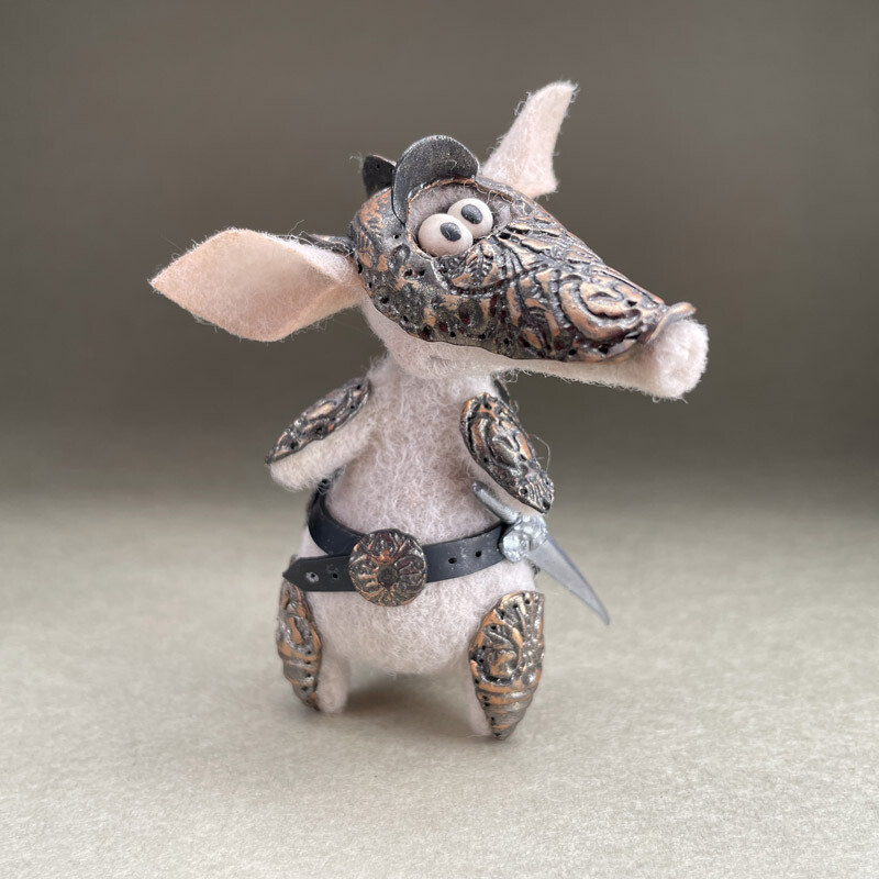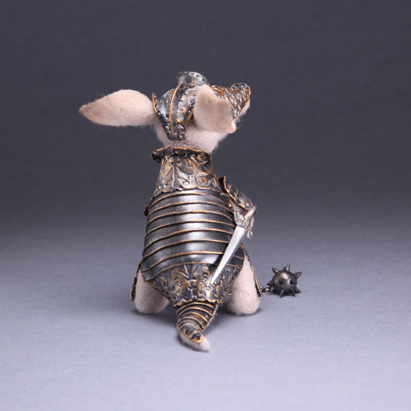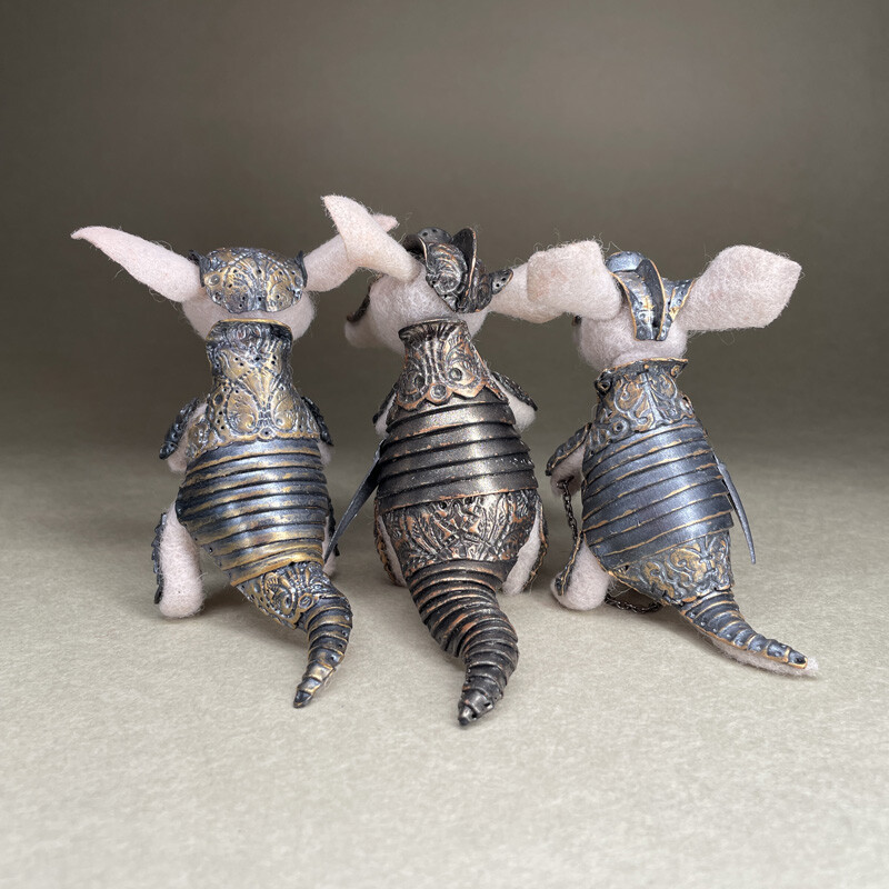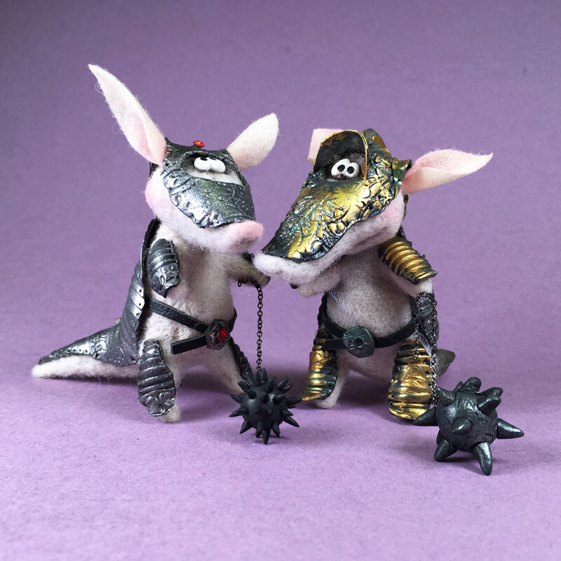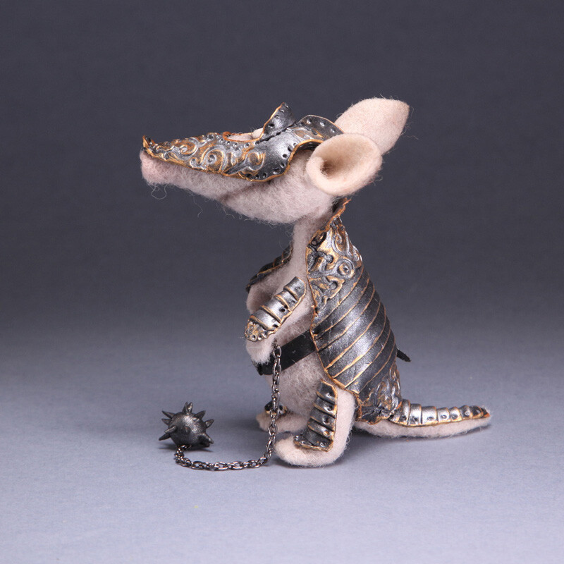 Фигурка Броненосца сделана из шерсти, а рыцарские доспехи с тонкой чеканкой и позолотой - из запекаемой полимерной глины.