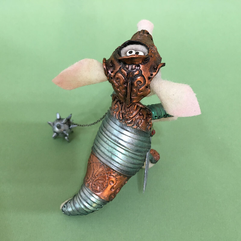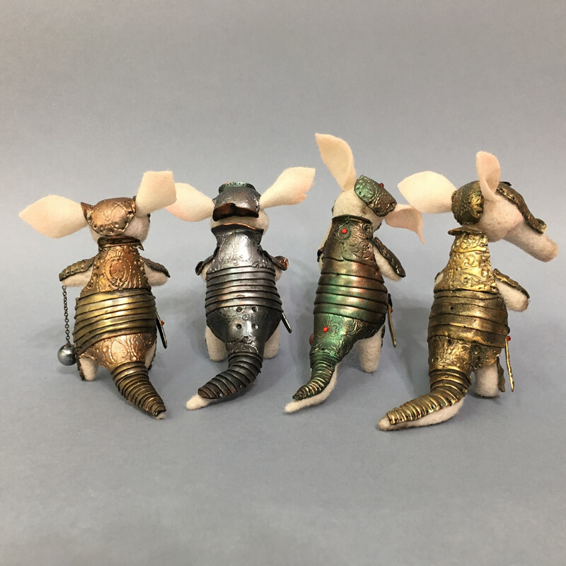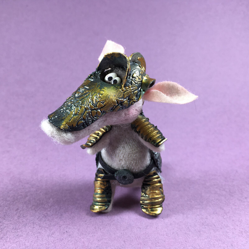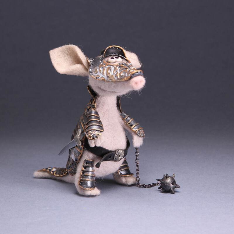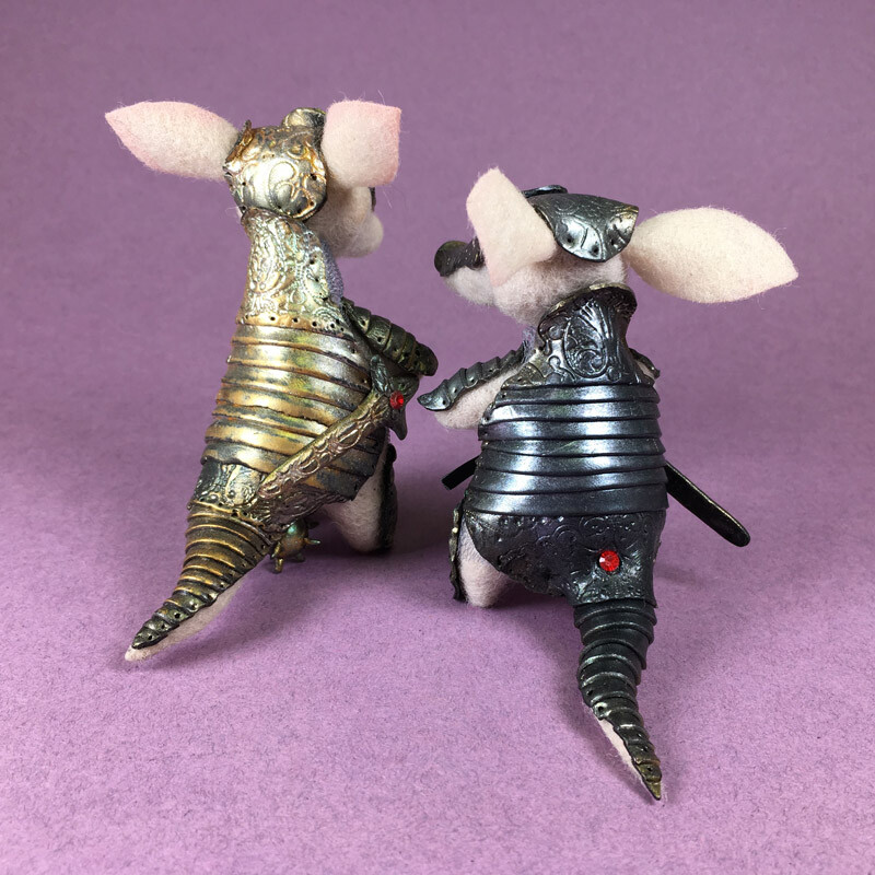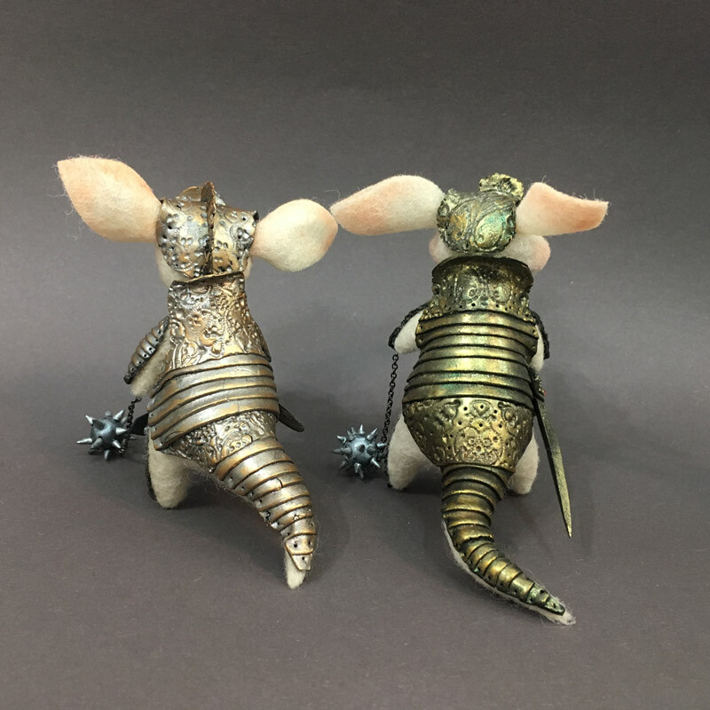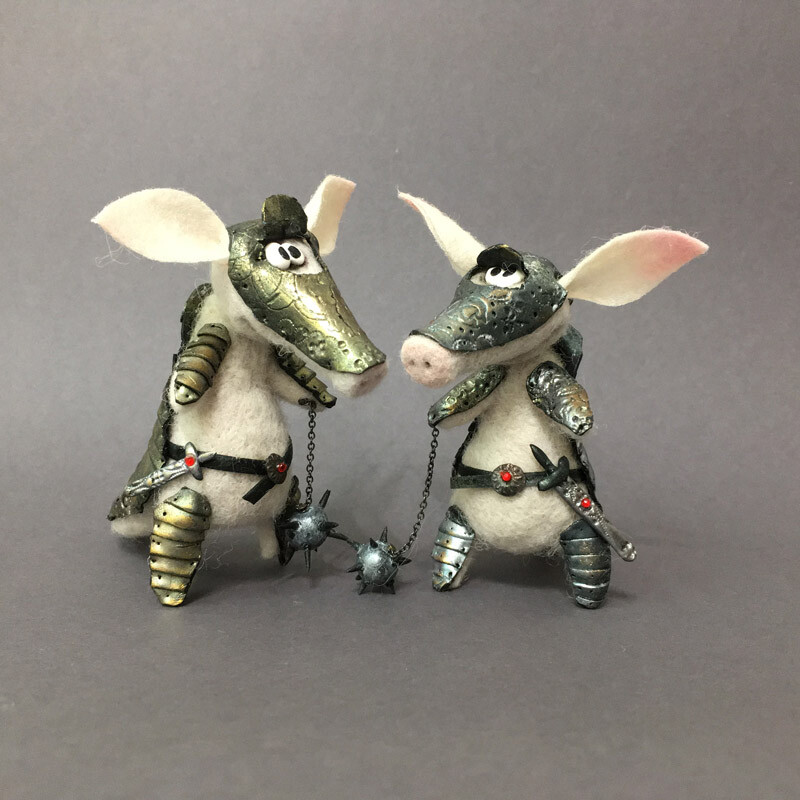 Фигурка Броненосца сделана из шерсти, а рыцарские доспехи с тонкой чеканкой и позолотой - из запекаемой полимерной глины.