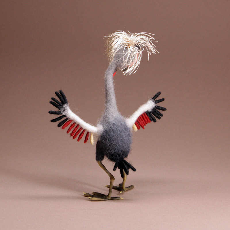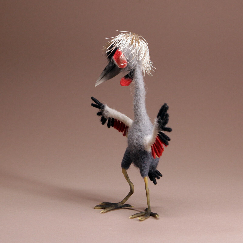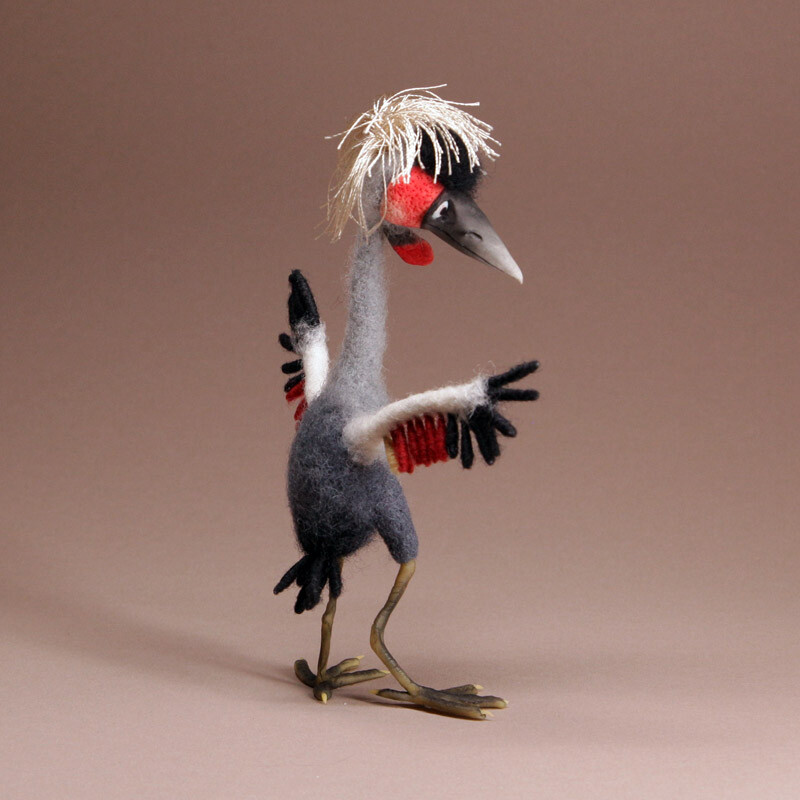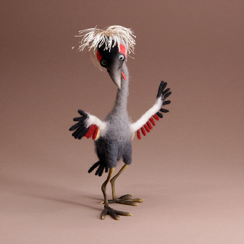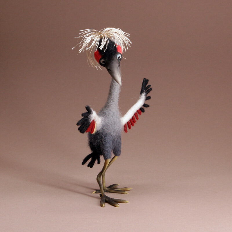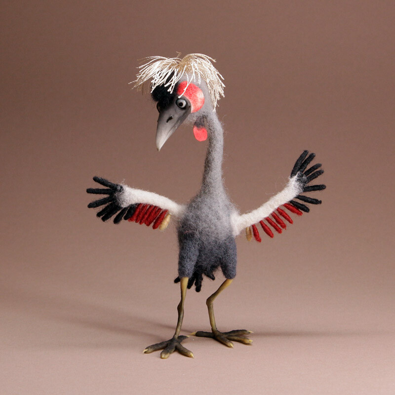 Кроме занятного клюва, у Журавля я применила новый способ изготовления перышек на каркасе, закрепляя шерсть с помощью пропитки. Это необыкновенно удобный, быстрый и легкий способ.